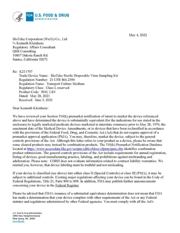 5月4日,百泰克生物的一次性使用病毒采樣管取得美國FDA 510K注冊批件,成為該類產(chǎn)品首個獲此國際權(quán)威認證的中國企業(yè)。