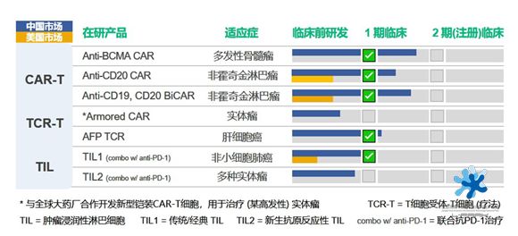 西比曼生物致力于開發(fā)用于治療癌癥和退行性疾病的專有細胞療法,在馬里蘭州羅克維爾的研發(fā)中心擁有5條GMP產品線,在中國無錫和上海的GMP設施由12條獨立的細胞生產線組成。公司的細胞療法技術平臺覆蓋血液瘤,實體瘤和干細胞療法,CAR-T 治療血液癌方面的研究包括潛在同類最佳的C-CAR039(治療復發(fā)或難治性B細胞非霍奇金淋巴瘤(r/r B-cell NHL)的新型CD19/CD20雙靶點CAR-T細胞產品)和C-CAR066(針對CD19 CAR-T治療復發(fā)的CD20單靶點CAR-T細胞產品),以及采用最新數(shù)字化生產體系的C-CAR088(治療多發(fā)性骨髓瘤的B 細胞成熟抗原 (BCMA) 特異性 CAR-T產品);實體瘤療法細胞治療平臺包括腫瘤浸潤淋巴細胞(TIL)技術以及第四代armored?CAR-T技術;干細胞療法方面,AlloJoin-異體脂肪來源間充質干細胞(haMPC)用于治療 KOA 的 II 期中國臨床試驗已完成并將啟動注冊性III期臨床,Re-join 人類自體脂肪來源間充質祖細胞用于治療膝骨關節(jié)炎 (KOA) 的 II 期臨床試驗正在進行中。