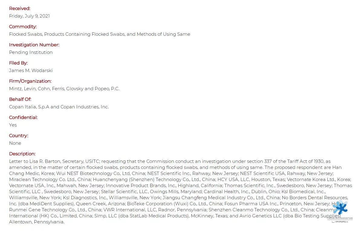 2021年7月9日,Copan根據(jù)337條款向ITC提出申請,主張對美出口、在美進(jìn)口及銷售的特定植絨拭子及其下游產(chǎn)品和方法侵犯其專利權(quán),建議ITC列為指定應(yīng)訴方的中國企業(yè)共有8家,百泰克生物決定聯(lián)合其他企業(yè)積極應(yīng)訴。
