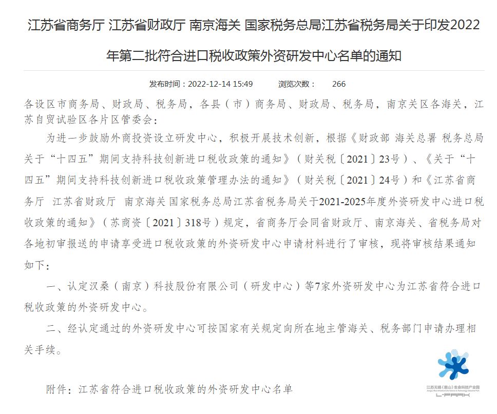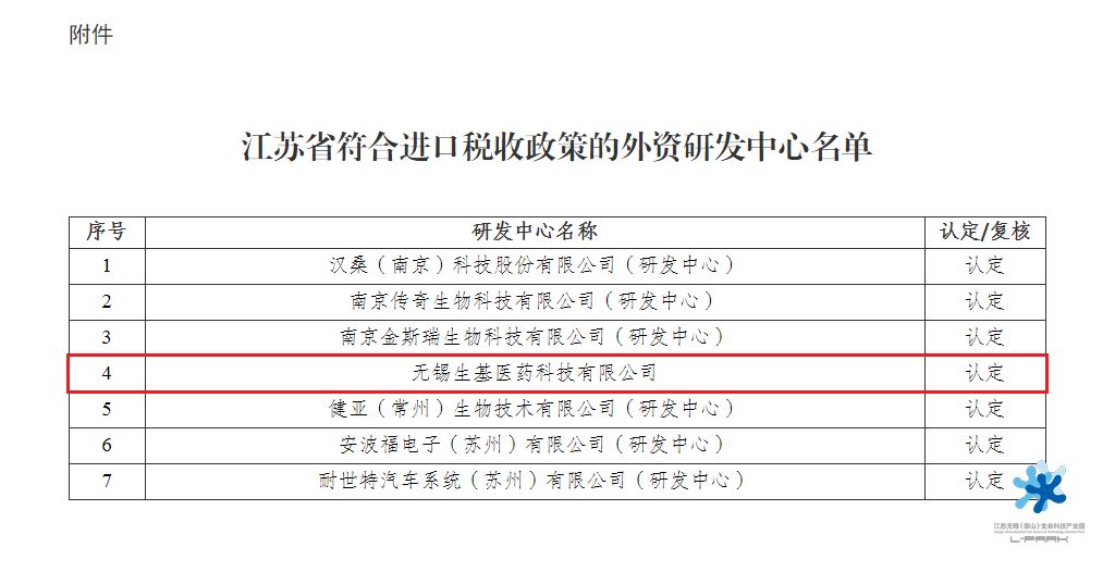 12月14日,江蘇省商務(wù)廳、江蘇省財(cái)政廳、南京海關(guān)和江蘇省稅務(wù)局聯(lián)合發(fā)布2022年第二批符合進(jìn)口稅收政策的外資研發(fā)中心名單,全省共7家企業(yè)新獲認(rèn)定,無(wú)錫生基醫(yī)藥科技有限公司為本次無(wú)錫唯一一家。至此,無(wú)錫共有10家外資研發(fā)中心新獲認(rèn)定或通過(guò)復(fù)核,其中惠山區(qū)兩家—保諾生物與生基醫(yī)藥,均為惠山經(jīng)開(kāi)區(qū)生命園企業(yè)。